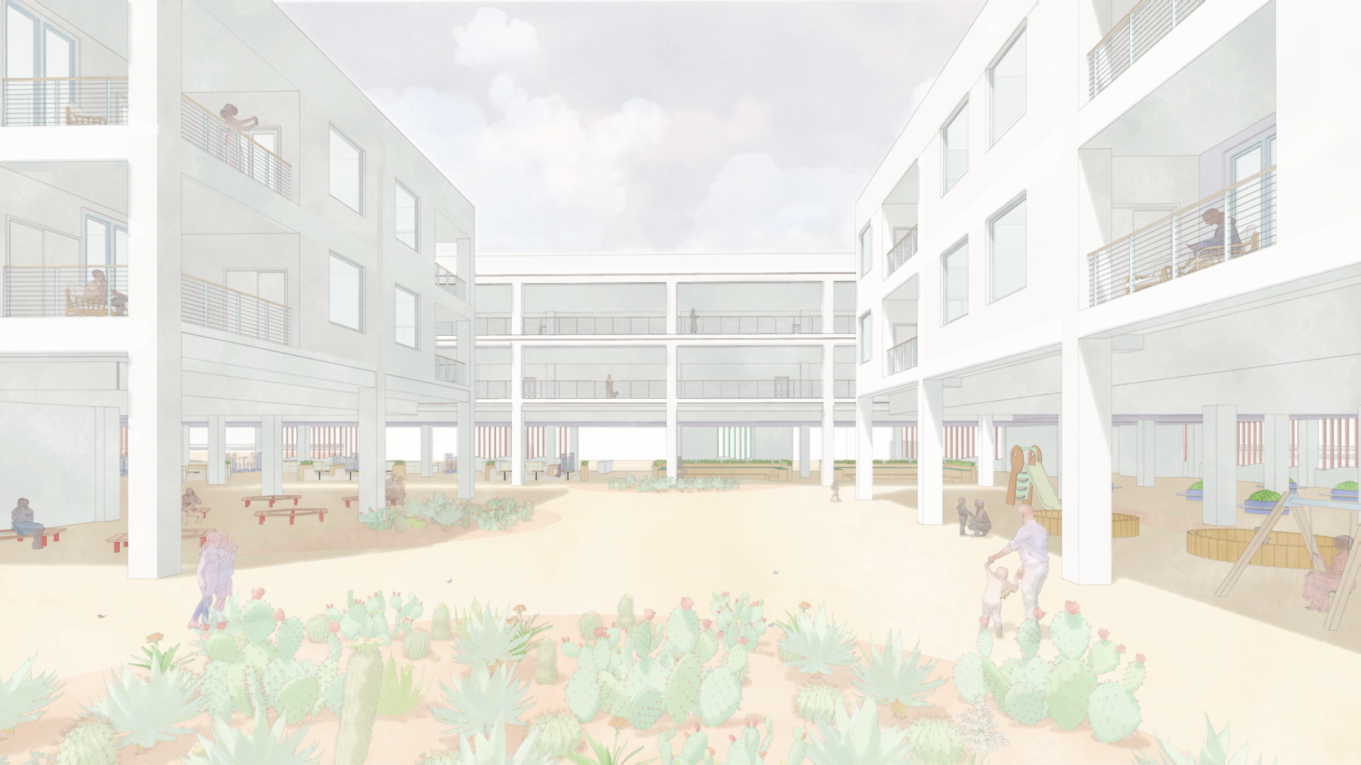 The name of the project, La Plaza, is intentional and foundational. It draws inspiration from the traditional layout of a Mexican town, where the plaza is the heart of civic life. In these towns, everything surrounds the plaza; the cathedral, local businesses, housing, and it is the primary space where people gather. Families meet, children play, vendors sell goods, and celebrations unfold. The plaza is not leftover space; it is the organizing element of the town and the social center of daily life.
