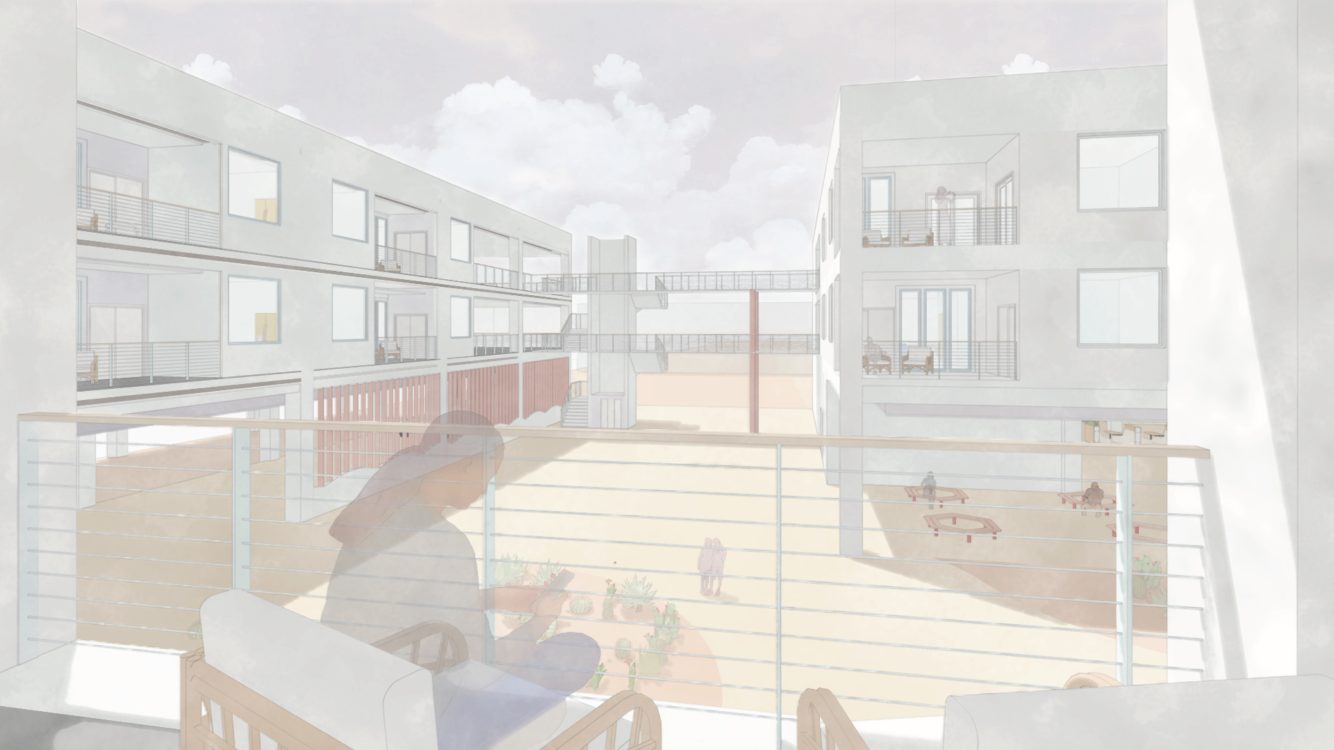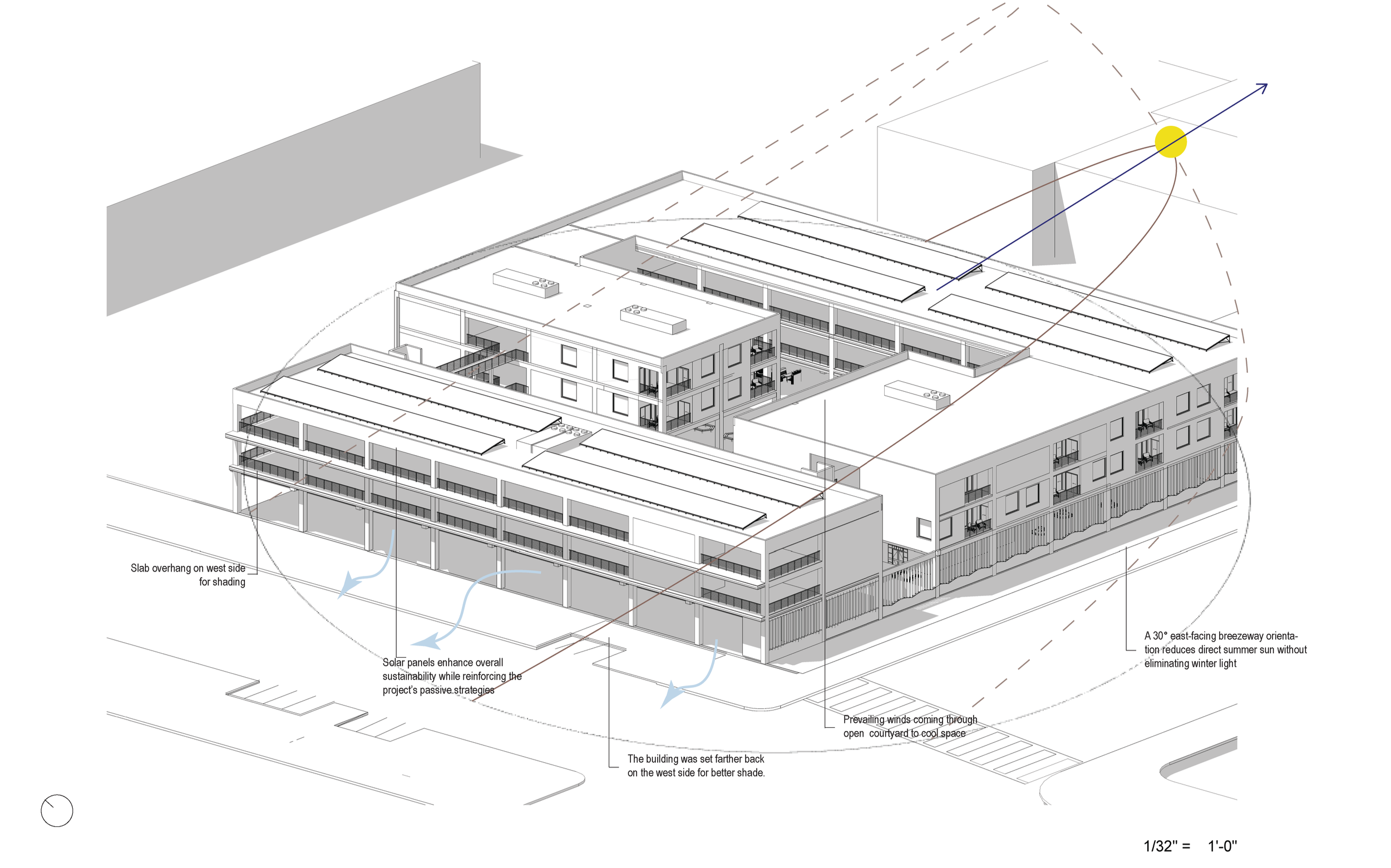 The site is shaped by major infrastructure, with the Valley Metro light rail providing strong urban connectivity and the adjacent APS substation reinforcing the district’s industrial edge. These conditions make the site both connected and constrained, prompting a courtyard-based design that turns inward to create a protected communal core. The courtyard buffers surrounding infrastructure while providing shared space, light, and ventilation rooted in the project’s plaza-inspired concept.