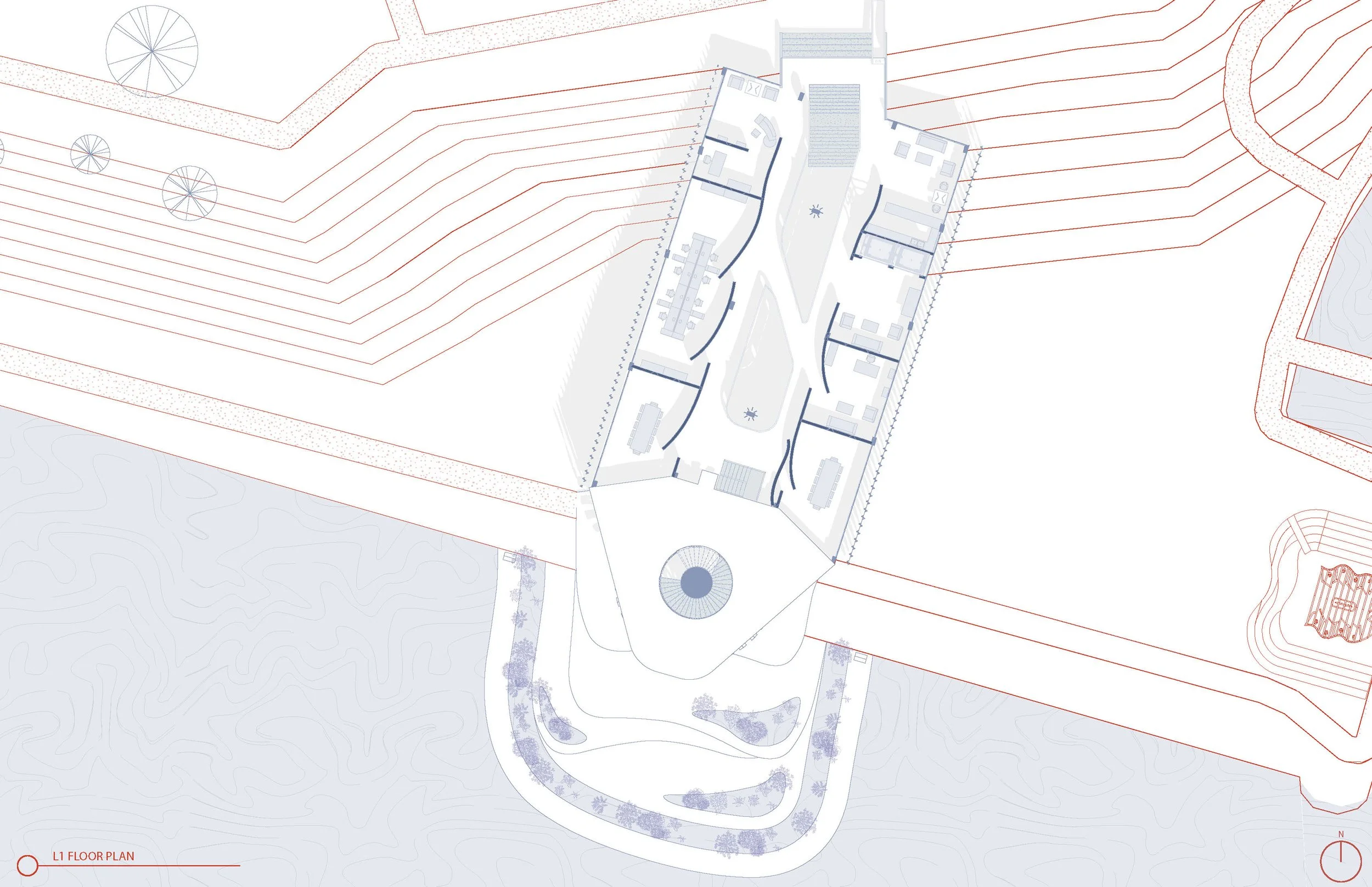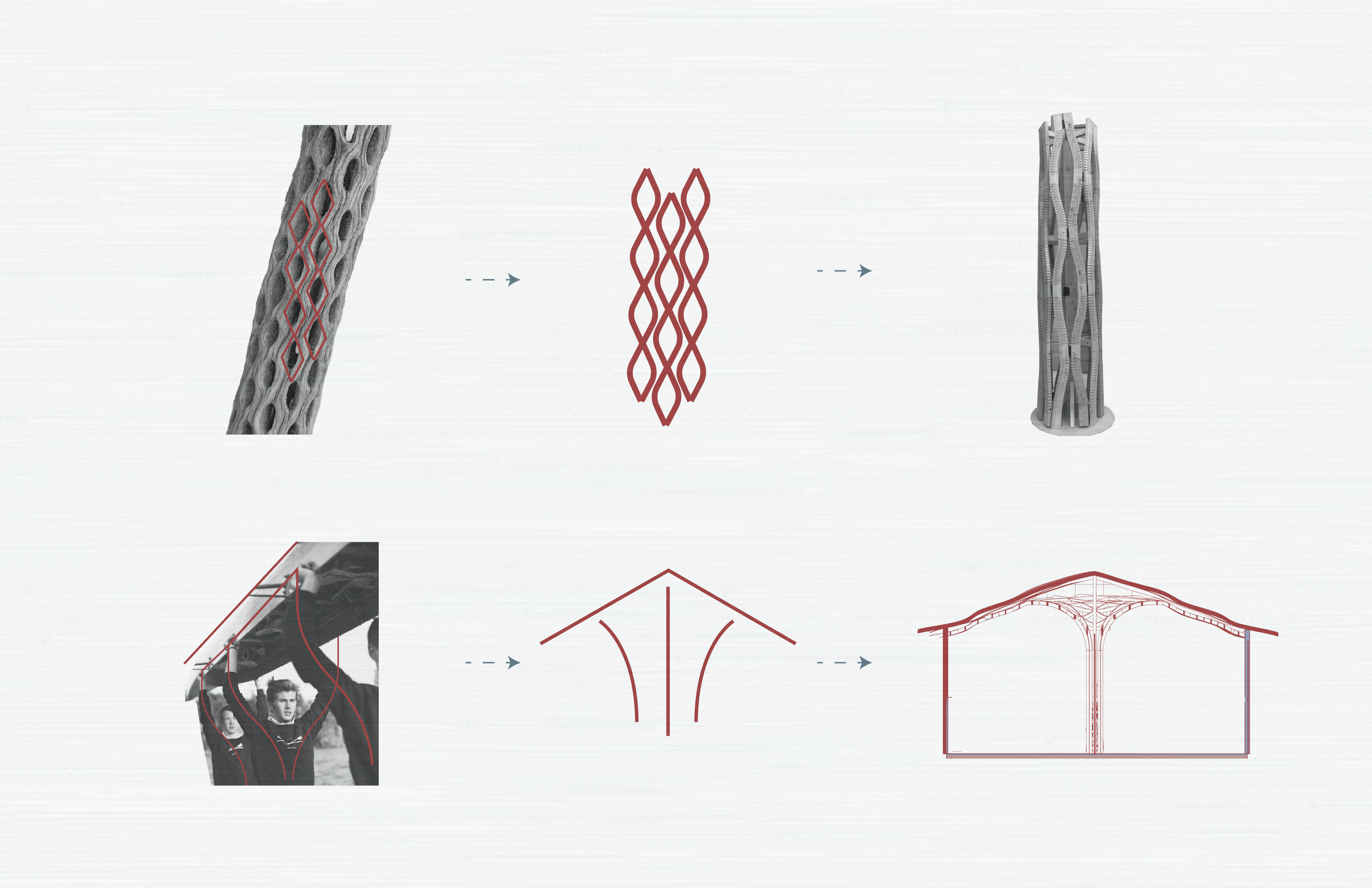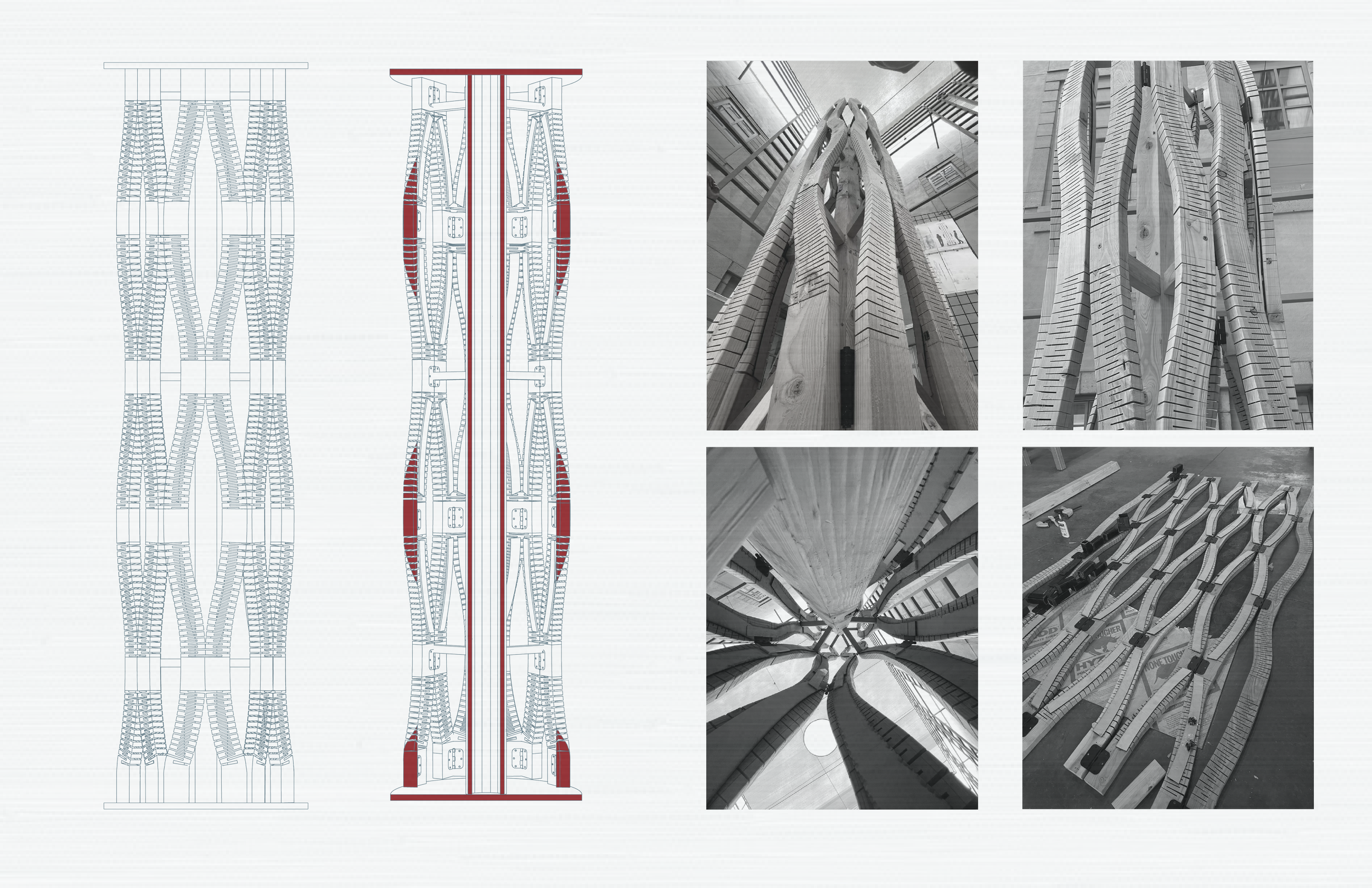 In the conceptual stage, we start with the experimentation of materiality and recreate an element of our building in a live scale. This model reflects our research on wood bending and kerfing patterns.