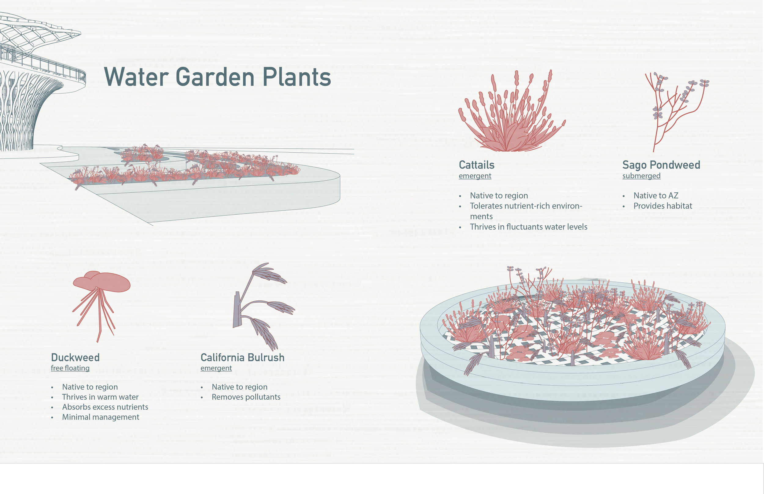 Addressing one of the weakness of our site, which is poor water quality, we are implementing a water garden that also improves water quality. This is done by the selection of the plant species.